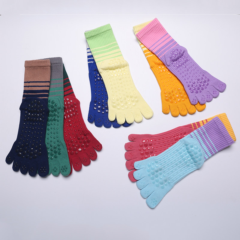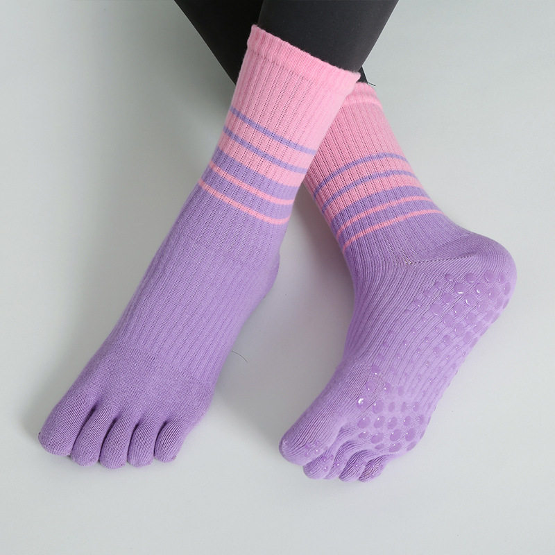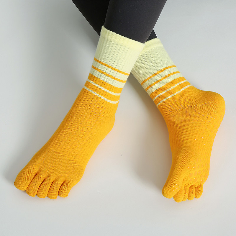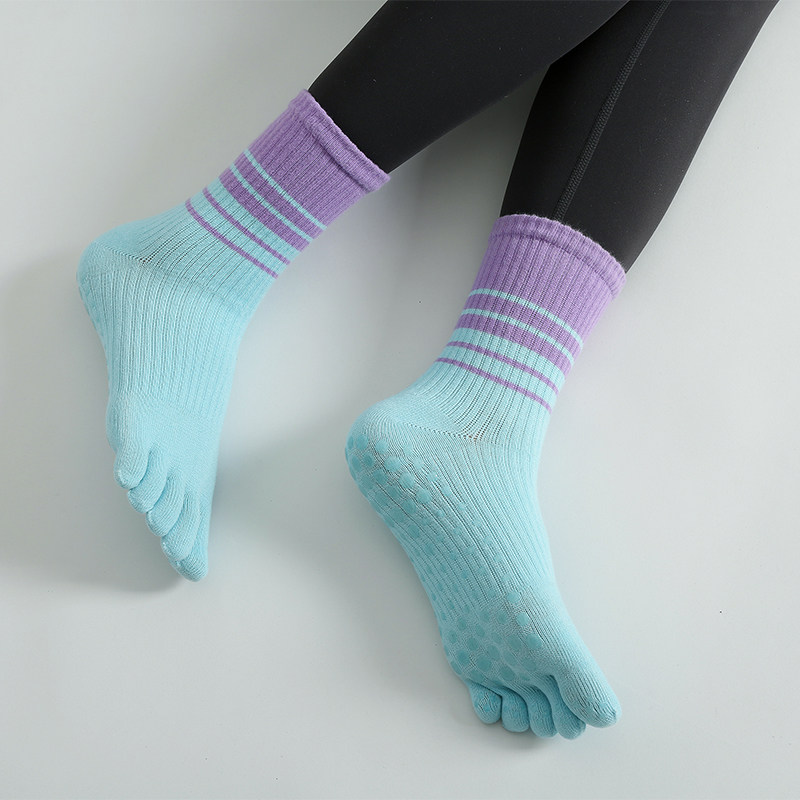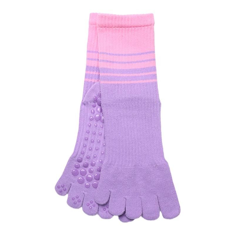 Ideal for customers searching for women’s yoga socks, toe socks, gradient stripe fitness socks, non-slip pilates socks, autumn winter indoor sports socks, and mid-calf workout socks, this style emphasizes grip support, seasonal comfort, and visual appeal—making it a versatile option for cooler-weather activewear sock collections.