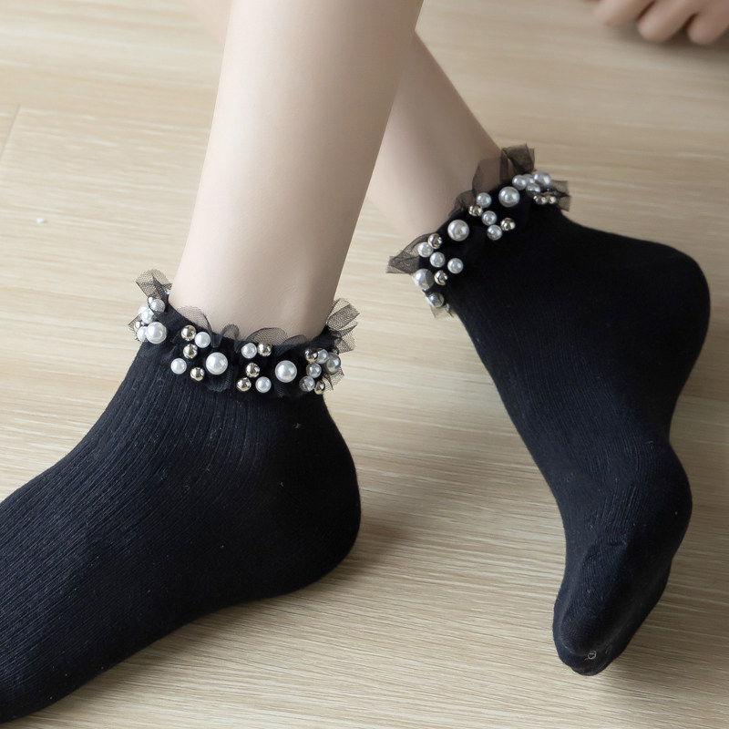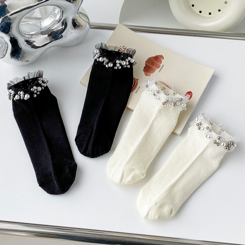 Ideal for customers searching for women’s lace socks, black and white socks, Japanese style socks, pearl detail socks, spring fashion socks, and cute mid-calf socks, this pair emphasizes decorative balance, styling flexibility, and seasonal comfort—making it a distinctive option for curated sock collections.