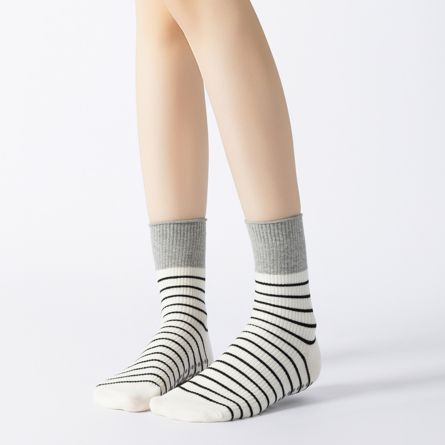 These striped contrast yoga socks for women are designed for yoga, pilates, stretching, and indoor fitness activities, featuring a clean color-blocked stripe design that adds a modern and sporty look. The lightweight construction makes them suitable for summer practice and warm indoor environments.